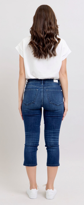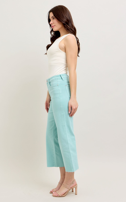 Light Sky Blue High-Waisted Garment Dyed Raw Hem Crop Wide Jeans