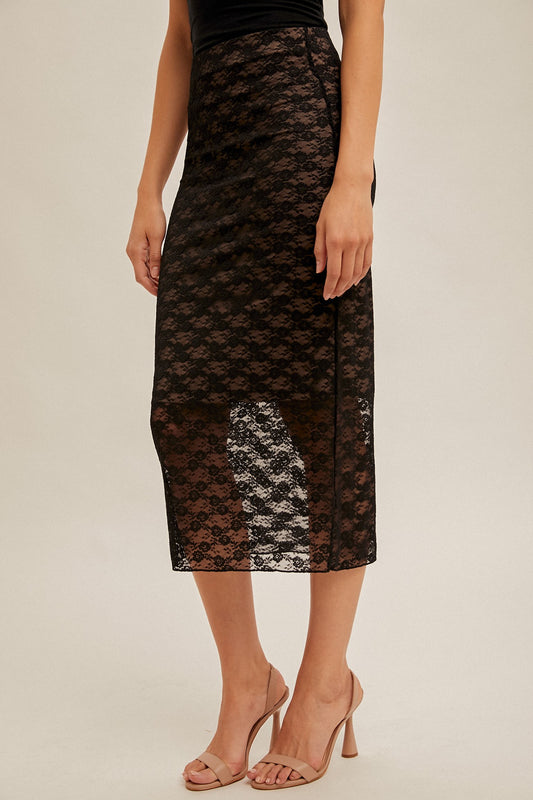 Black Stretchy Floral Lace Midi Skirt With Lining