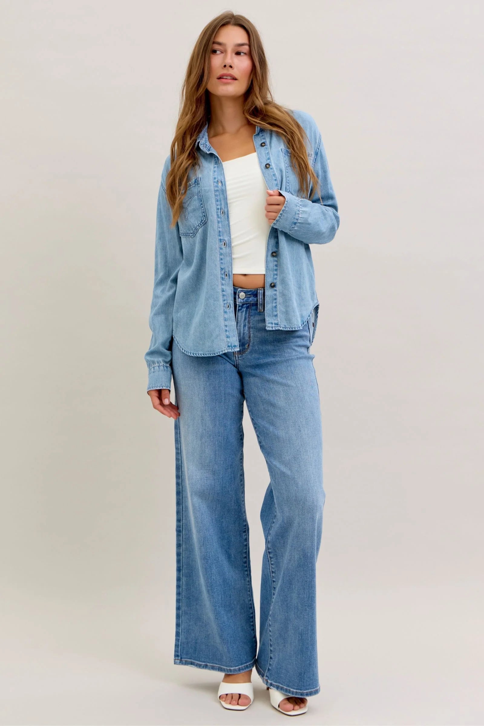 A timeless classic with a modern twist — this Judy Blue denim shirt combines rugged western details with the softness and stretch Judy Blue is known for. Designed to be your go-to layering piece, it can be worn buttoned up for a polished look or left open over a tee for effortless style. The subtle western yoke and tailored fit give it that true denim heritage vibe.