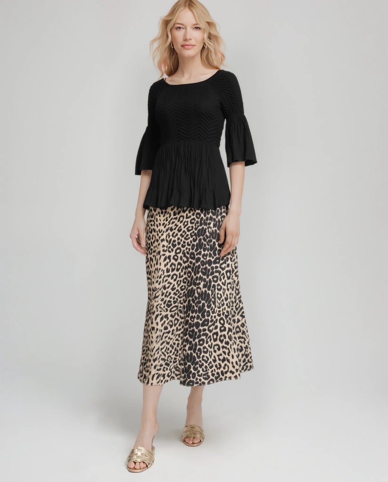Because of the voluminous sleeves and sweep hem, balance the look with a fitted bottom—such as tailored trousers, a slim midi skirt, or high-waisted pants.