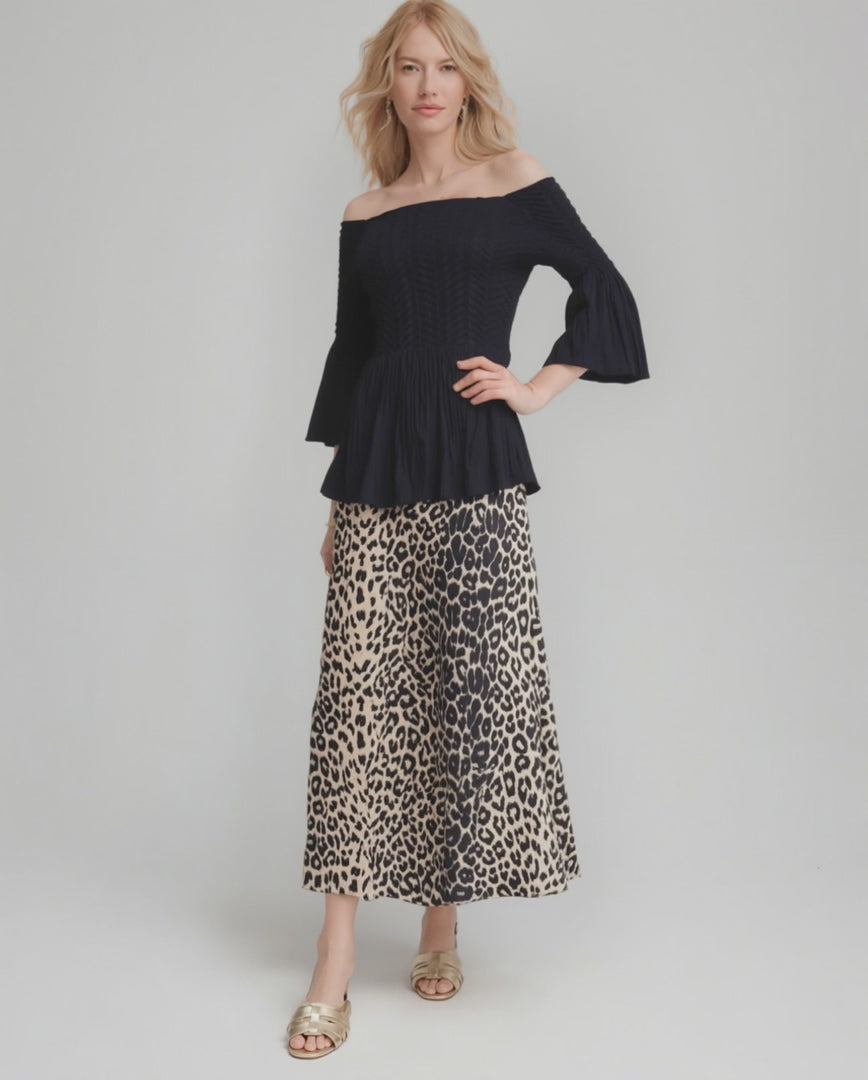 This blouse features a wide off-shoulder neckline that elegantly exposes the collarbones and upper shoulders, creating a soft, refined top line. The body of the blouse is crafted from finely pleated fabric that falls into a subtle “sweep” hem—gently flaring out from the bust and waist to allow graceful movement and a relaxed fit. The dramatic flared sleeves begin at the elbow (or slightly above) and open into a wide bell shape, echoing the pleated texture of the body while adding a fluid, voluminous finish.